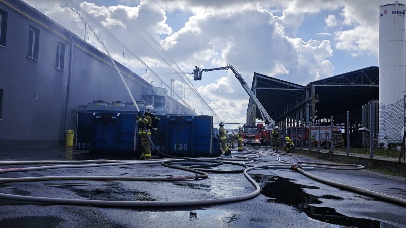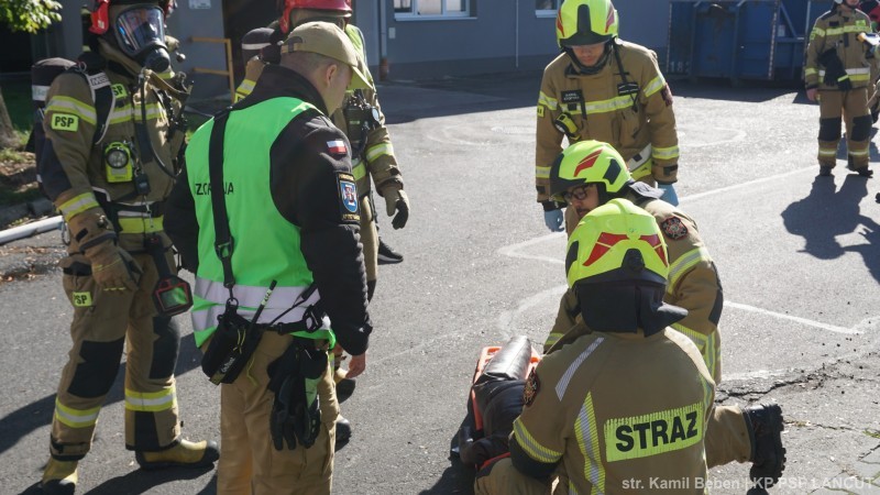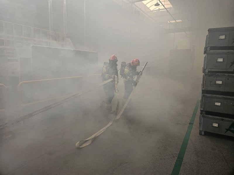 Podczas procesu technologicznego w hali produkcyjnej dochodzi do zapalenia oleju hartowniczego, znajdującego się w misie roboczej maszyny. Podjęta przez pracowników akcja gaśnicza nie przynosi efektu - gęsty dym ogranicza widoczność, a jego toksyczne produkty spalania działają drażniąco na układ oddechowy. Pracownicy w panice opuszczają miejsca pracy i poszukują kierownika w celu przekazania informacji o powstałym pożarze. Ogień obejmuje maszynę produkcyjną oraz misę z rozgrzanym olejem. W wyniku działania wysokiej temperatury dochodzi do uszkodzenia zbiornika o pojemności 1000 litrów z olejem hartowniczym, ustawionego na pojemniku zlewowym z polipropylenu. Uszkodzenie to powoduje rozlanie znacznej ilości oleju na posadzkę hali, co prowadzi do intensywnego rozwoju pożaru i gęstego, toksycznego zadymienia. Pożar dynamicznie rozprzestrzenia się na całą halę produkcyjno-magazynową, a kłęby dymu przedostają się do części administracyjno-biurowej, ograniczając widoczność i wymuszając natychmiastową ewakuację pracowników. Działania ratowniczo-gaśnicze prowadzone przez zastępy PSP i OSP obejmowały m.in.: • zabezpieczenie miejsca zdarzenia, • podanie prądów piany gaśniczej na powierzchnię płonącego oleju, • przeszukanie zadymionych pomieszczeń, • ewakuację poszkodowanych oraz • organizację zaopatrzenia wodnego na potrzeby działań. Epizod ten pozwolił na praktyczne sprawdzenie organizacji działań ratowniczo-gaśniczych, współdziałania służb oraz skuteczności systemów ewakuacyjnych zakładu.