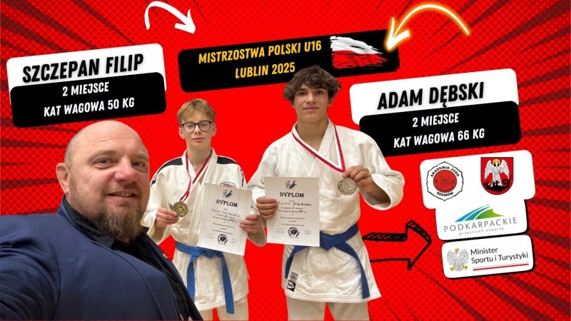 -Z ogromną radością i dumą informujemy, że dzięki ciężkiej pracy i determinacji, dwóch naszych wychowanków zdobyło tytuły Wicemistrzów Polski U16 podczas zawodów w Lublinie! To osiągnięcie to nie tylko medale, to dowód na to, jak skutecznie buduje się sportową przyszłość w naszym Mieście Łańcut!- Akademia Judo Rzeszów Dwóch historycznych Wicemistrzów Polski: 1. Szczepan Filip - Srebrny Medal i tytuł Wicemistrza Polski w kat. 50 kg! 2. Adam Dębski - Srebrny Medal i tytuł Wicemistrza Polski w kat. 66 kg!